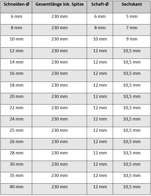Unser Holz Spiralbohrer mit der Länge von 230mm enthält die folgenden Durchmesser: