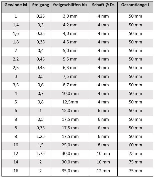 - alle Gewindefräser sind auch für größere Gewinde geeignet (z. B. der M3x0,5 ist auch für M8x0,5 verwendbar, solange die Steigung gleich bleibt)